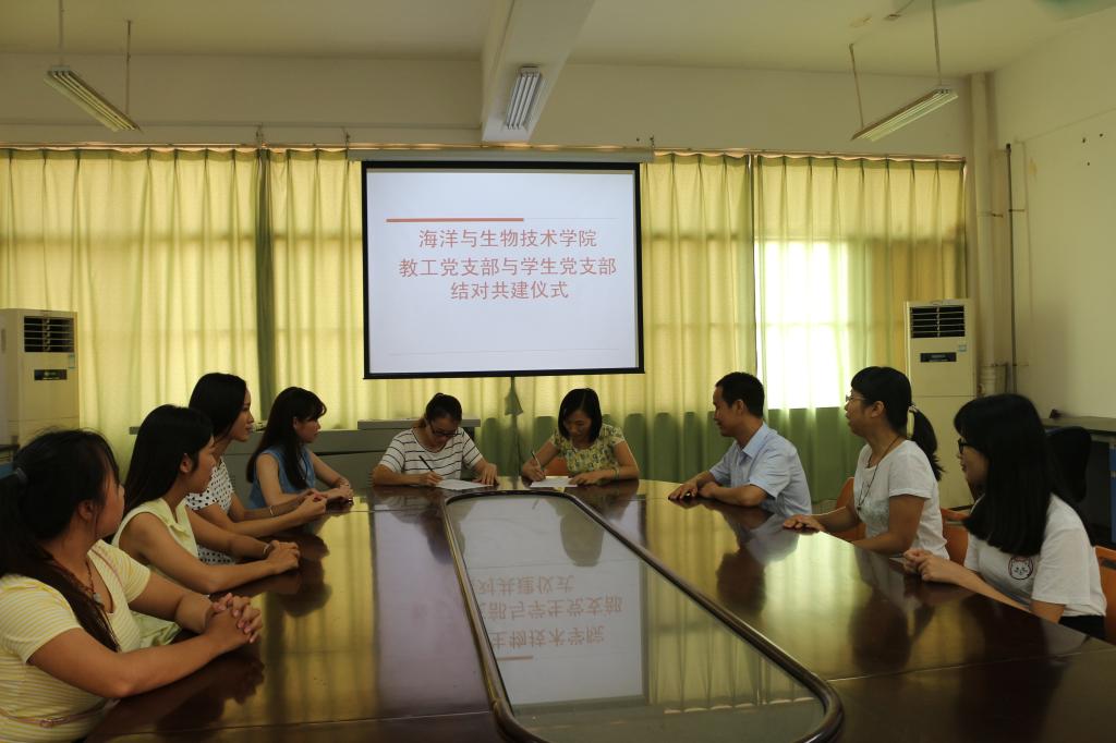 9月23日上午,为深入贯彻执行学校“两学一做”学习教育的相关精神。我院教职工党支部与学生党支部于扬帆楼(原理工实验楼)615会议室举行“结对建设”签约仪式。参加本次仪式的教职工党支部有袁汉文副院长、生物技术系主任何秀苗、办公室主任梁锦华;学生党支部有团委学生会常务黄彩叶、组织部长李艳萍、学习部长吴秀迪等同学。