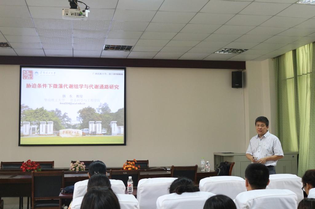 首先,周桂副院长作为主持人向同学们介绍了魏东教授的基本情况及实验室取得的成绩。接着,魏教授以广西著名原材料“木薯”为切入点,点出了当今社会较关注的能源问题。通过分析、对比木薯里的淀粉产生的乙醇与石油等生物能源,指出乙醇的能量密度比油、脂肪的低,所以指出“油”仍是为人们所不可缺少的能源物质。